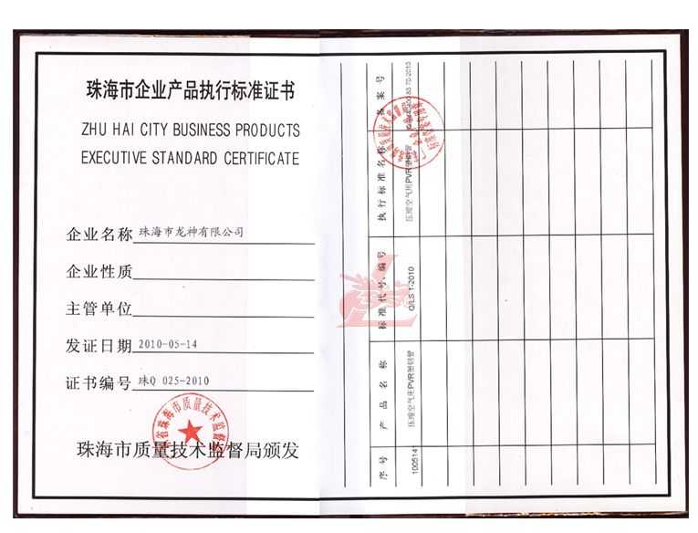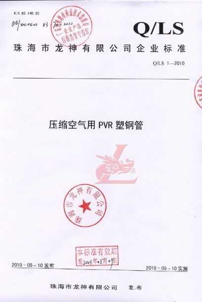 龍神壓縮空氣PVR塑鋼管成功申請企業執行標準 2010年5月珠海市龍神有限公司“壓縮空氣PVR塑鋼管”得到珠海市質量技術監督局認可,特此頒發“壓縮空氣PVR塑鋼管企業執行標準”,龍神公司在嚴格執行標準下,保證產品質量。 2010-05-20 10053